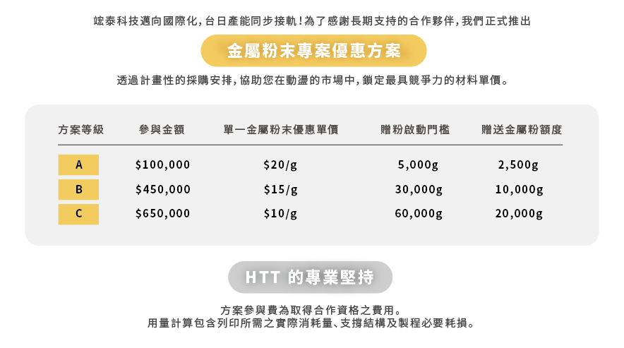 1、重量計算以 HTT 實際列印製程之報價重量為準(包含支撐與製程耗損),不以零件淨重為計算依據。